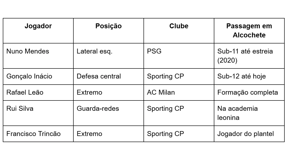 Essa influência mantém-se na seleção atual. Na convocatória de março de 2026 para os amigáveis frente ao México e aos Estados Unidos, vários jogadores passaram por Alcochete. Entre eles: